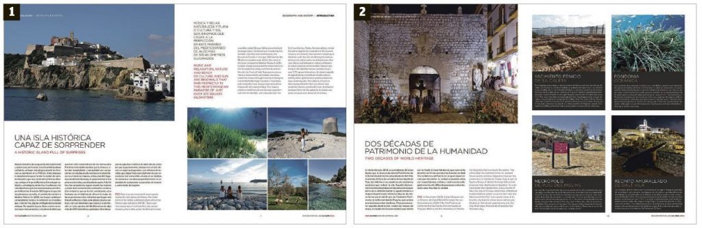 Some pages inside the magazine The new magazine, with revised and updated content, will be published at the beginning of July in Spanish and English and adapted to the sector’s new circumstances. In more than 250 full-colour pages, 100-gram couché paper and glossy covers the Ibiza Guide will cover the beauty, places and everything else that the islands have to offer residents and visitors throughout the year. The history, heritage, culture, fashion, art, museums, folklore, architecture, hotels, gastronomy and leisure, sports as well as wellness, markets and shopping will be described with guides and magnificent photographs from the best photographers in the Pitiusas.