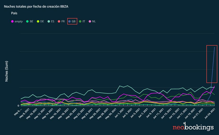 On the 23rd of June, the day before it was made official that the UK included Ibiza in its green traffic light, “there was already a certain euphoria about what was expected to happen and there was a 223% increase in bookings from the British market”. And on 24 June, when the British Minister for Transport, Grant Shapps, announced the inclusion of the Balearic Islands at that level , “in a matter of hours, nothing more and nothing less than the record for bookings was broken, not only for the season, but since we have had a record at Neobookings “. It was an increase of 459% over the previous day: “The equivalent would be to fill 12 hotels with 40 rooms for a whole month. And only with English, Welsh and Scottish people.