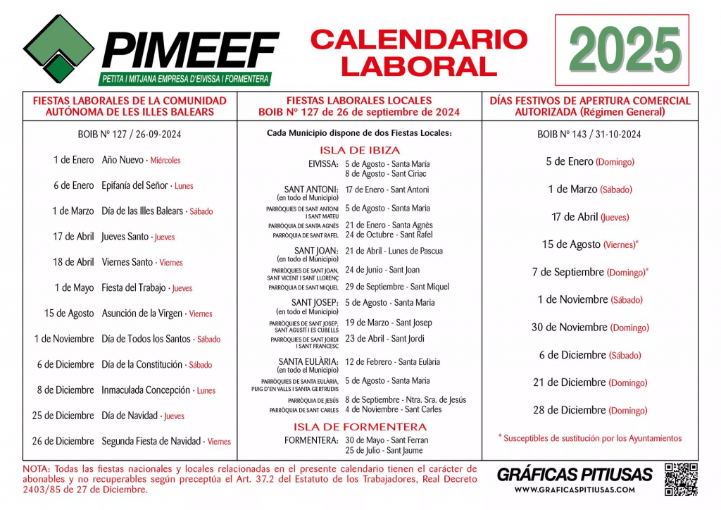 Below is a detailed breakdown of the 2025 holiday calendar, including local celebrations across Ibiza’s municipalities and Formentera’s unique festivities.