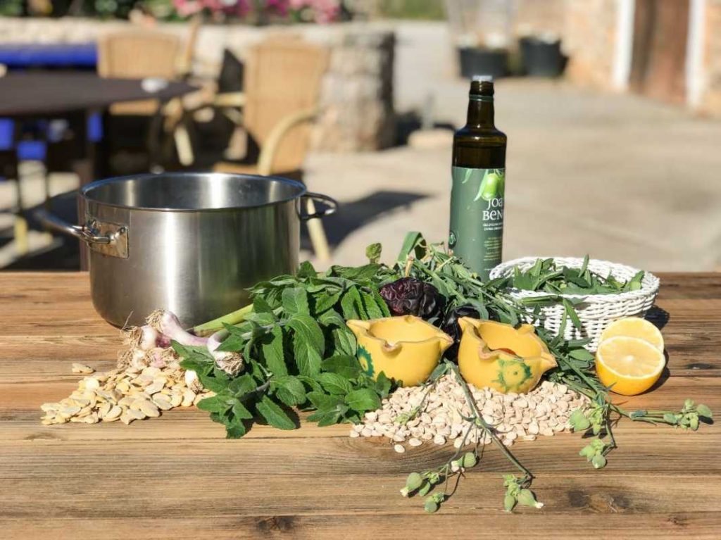 Ingredients: 2 kg of collejas, 1/2 kg of almortas, 1 kg of peeled beans, 3 heads of garlic, 3 bunches of garlic shoots, 2 large bunches of peppermint leaves, 3 spicy red peppers, Ibiza olive oil, salt and a teaspoon of sweet paprika. If you want you can also add a bunch of very finely chopped chard..