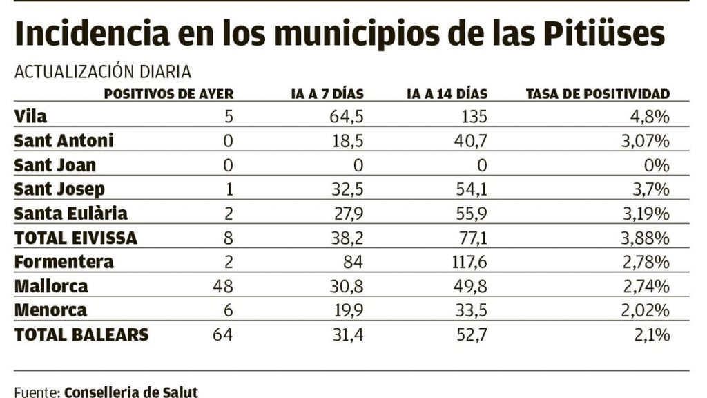 This development has occurred after the Ibiza and Formentera Health Area laboratory detected fifteen infections during the weekend – eight on Friday, seven on Saturday and one on Sunday- with no new hospital admissions during that period. All the identified cases originated on the island of Ibiza, while no new infections have been identified on Formenerta since recording eight last Thursday due to a work-home outbreak. The worsening health situation has resulted in an increase in cases, with no increase in the number of patients admitted to the Intensive Care Unit. Of the seven patients requiring hospital care – all of them in Can Misses – there are six on the ward and one is being treated in the centre’s ICU.Meanwhile, the mild or asymptomatic cases who are recovering from the virus at home and are being cared for by Primary Care professionals add eleven more to the previous count. Thus, there are 176 infected patients being monitored by telephone by Ibiza and Formentera Health Area Primary Care professionals. Of these 188 mild or asymptomatic patients, 173 are in Ibiza and the remaining 15 in Formentera.
