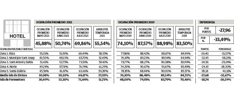 By island, Ibiza, with 70% of its total hotel accommodation open, had an occupancy rate of 69.6% at the end of last month, compared to 71.4% for Formentera, with practically 100% of its hotels and tourist apartments open. In July 2019, the last year of ‘normality’, Ibiza averaged a hotel occupancy rate of 89.5%, 22.2% more; and Formentera stood at 83.7%, 14.7% more than 2021 levels.
