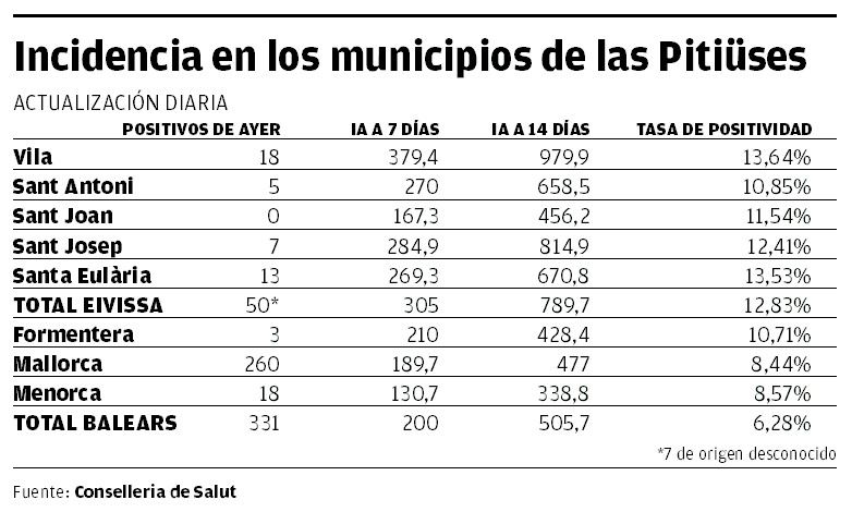 Right now this municipality, which has the highest rates of the islands, has a 14 day case rate of 979.9 and a 7 day case rate of 379.4. The rates of Sant Joan, the least affected by the virus in Ibiza (and number 20 in the Balearic Islands) are 456.2 infections per hundred thousand inhabitants at fourteen days and 167.3 at seven. The island of Ibiza still has the highest rates of the Comunitat, although the difference lessens with respect to the other islands as time goes on.